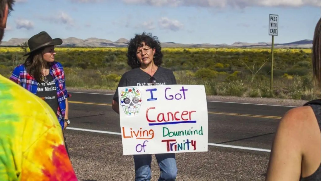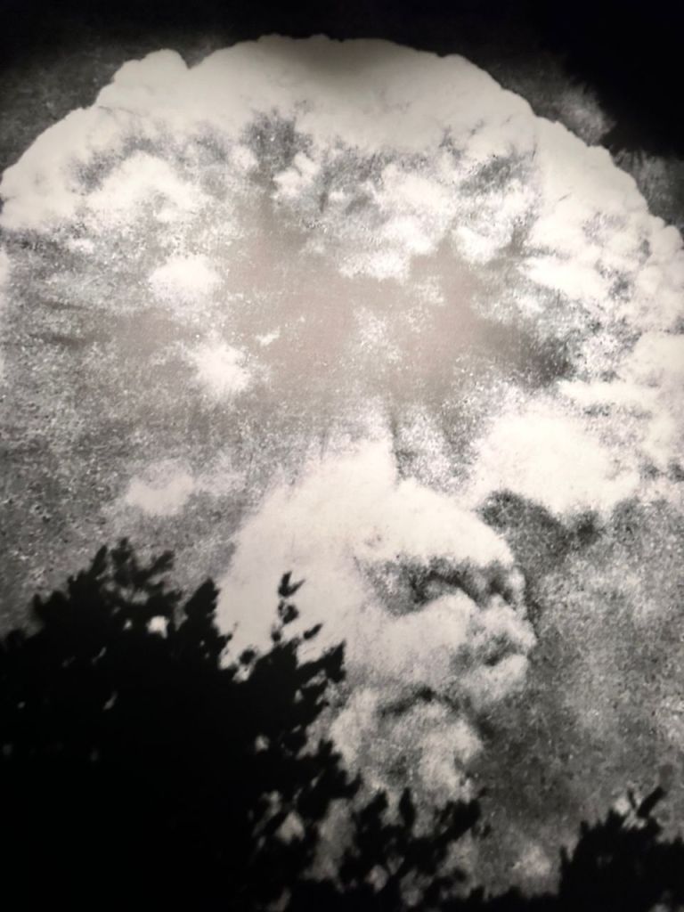 El 16 de julio de 1945, hacen la prueba en el desierto de Los Álamos, en Nueva México (que aún hoy sufre los efectos de la radiación) y Oppenheimer le da cariz religioso, bautizándola Trinity, en alusión al soneto sagrado XIV, de John Donne: Batter my heart, three-person’d God…
