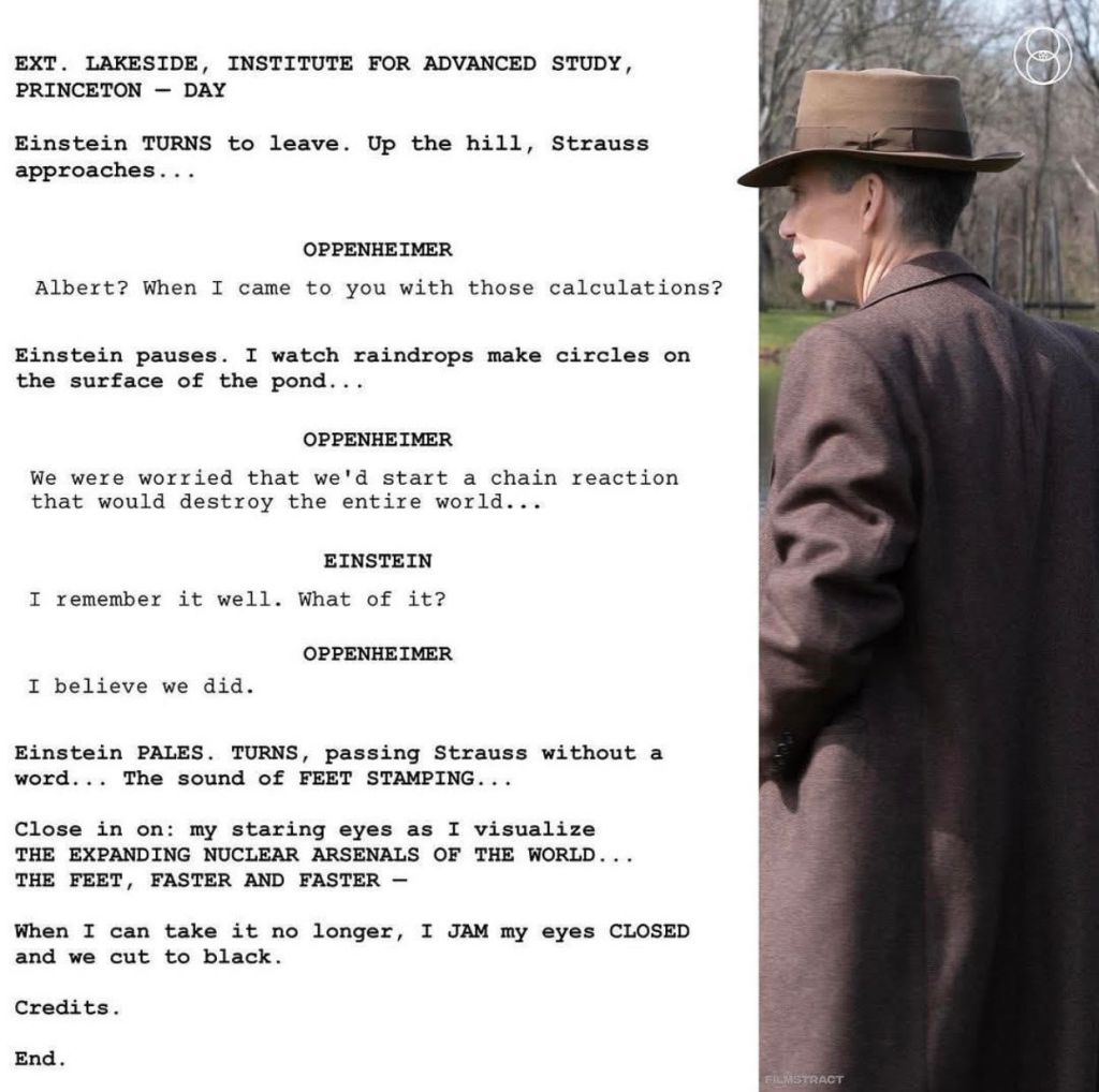 Merece especial reconocimiento el guion en las escenas a la víspera de la explosión nuclear: funciona a la perfección. El diálogo entre Oppenheimer (Gillian Murphy) y Groves (Matt Damon), justo antes de activar la explosión, es ¡extraordinario! En este intercambio de palabras, la escogencia de Matt Damon para representar a Groves se siente imprescindible. No se me ocurre a nadie mejor que él para la altura que se logró con este diálogo. La tensión que se crea está muy bien lograda, mezclando el terror con la justa dosis de comicidad (al mejor estilo de David Lynch):