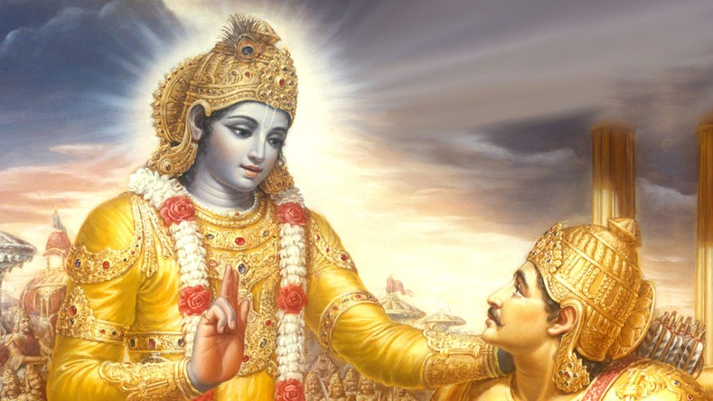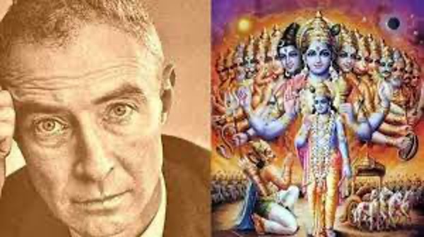 En el libro sagrado del hinduismo, Arjuna sufre dilemas similares a los que padece Oppenheimer, que logra disipar gracias a Krishna, quien le convence de atacar a sus propios parientes para así salvar a los reinos de males mayores. Krishna, encarnando al dios Vishnu, saca a la luz sus cuatro brazos y le recita a Arjuna: “Now I am become death, the destroyer of worlds”.
